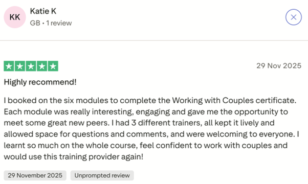 “A really comprehensive, interesting and diverse certificate training, with a range of different professinoal covering many different aspects – a solid foundation in couples therapy! ” Sam, Counsellor: Sam has completed the 6 modules